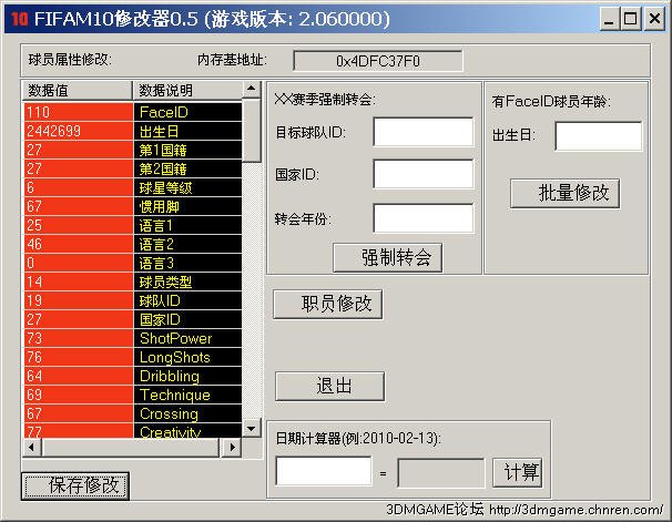 2010-02-23 v0.2版,更新带FaceID球员(有对应的3D头部模型文件)的年龄批量修改,防止其退役,不然几年后游戏里就3D比赛时就都是一堆堆的大众脸了.修改方法是启动修改功能后,切换到不同的界面,如果搜索界面,打开任意球员的属性面板,关闭后该界面下所有有FaceID的球员就都会变成指定的出生日.
