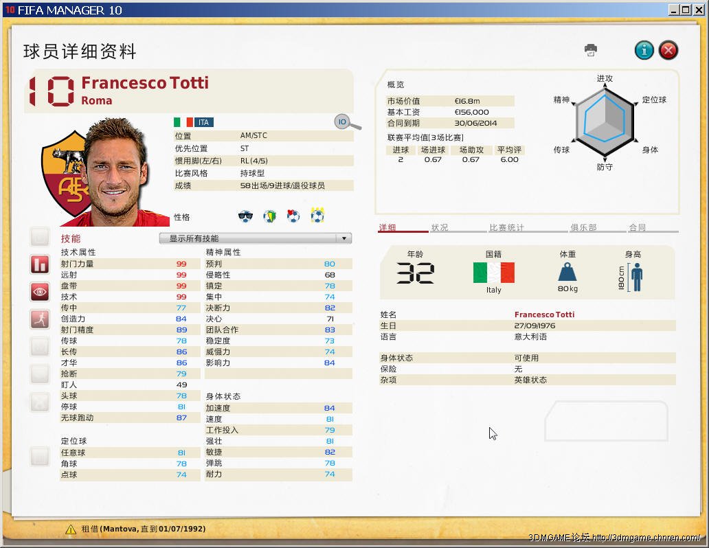 比较出彩的是强制转换,实现效果是将球员当前契约变为租借契约,这样租借契约到期后,该球员就会自动回到指定的球队(如Totti在Roma的契约到2014年,修改后,就可以让其2010年7月1日离开罗马,转至你的球队).