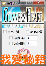《Gunners Heart》这款游戏剧情还是不错的,支持下!呵呵!本人玩游戏只为了看剧情,不追求什麽的,粗略做了修改器,做得不好,见谅下,需要的ZYM就下载吧!!!