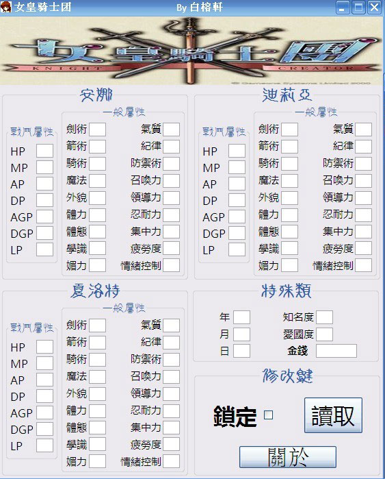 《女皇骑士团》这款游戏剧情还是不错的,支持下!呵呵!本人玩游戏只为了看剧情,不追求什麽的,粗略做了修改器,做得不好,见谅下,需要的ZYM就下载吧!!!