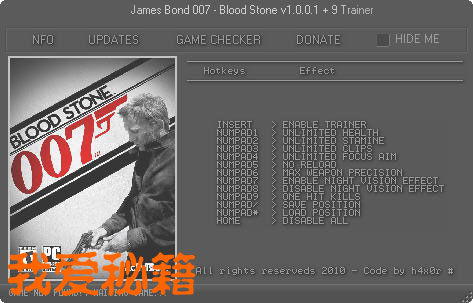 | 2010.11.03 | 詹姆斯邦德007:血石v1.0.0.1修改器 + 9 | - | - |