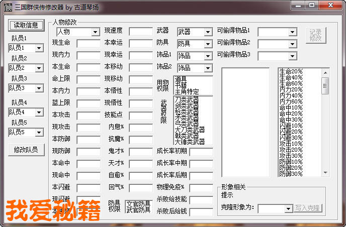 1.读取资料,您可以单击“读取信息”按钮(推荐),若在游戏开启的状态下,您也可以在人物修改处单击下拉列表选择(不建议用)。(建议您点击读取信息后先点击一次记录修改,详情见3)