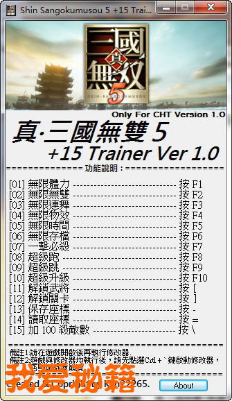 | 2010.11.26 | 真三国无双5v1.0繁中版修改器 + 15 | - | - |