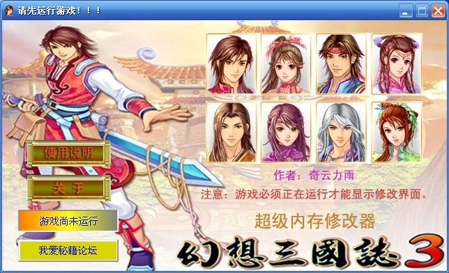 修改项目:等级、体力、真气、力量、仙骨、强壮、御法、速度、金钱、大地图不遇敌、迷宫不遇敌、战斗立即结束、人物坐标。可修改角色:夏皓、张捷、默心、啸月、瞳影、马元义、水湘灵、唐周。游戏必须正在运行才能显示修改界面