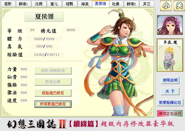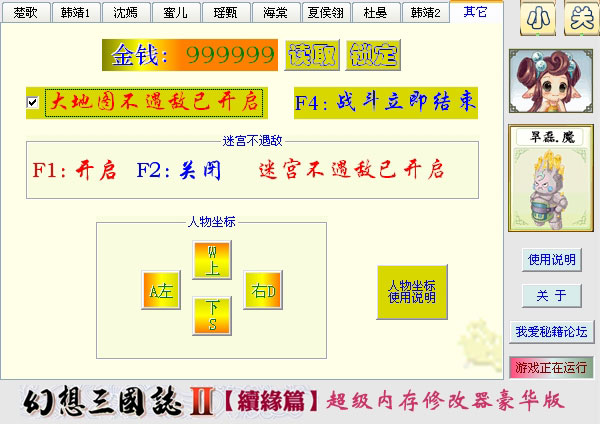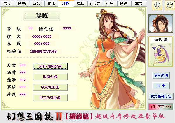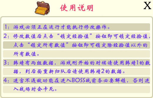 可修改所有角色的所有人物属性和金钱以及不遇敌、人物坐标等特殊数据。 具体修改项目有:等级、精元、体力、真气、经验、力量、仙骨、强壮、御法、速度、金钱、大地图不遇敌、迷宫不遇敌、战斗立即结束、人物坐标。