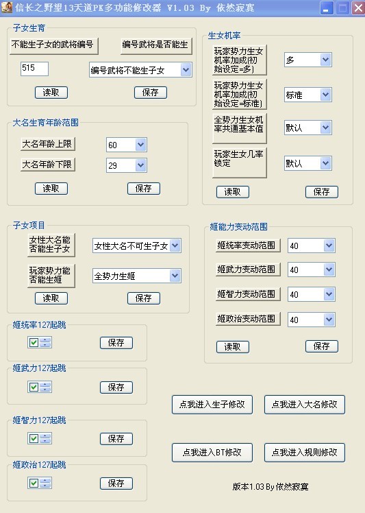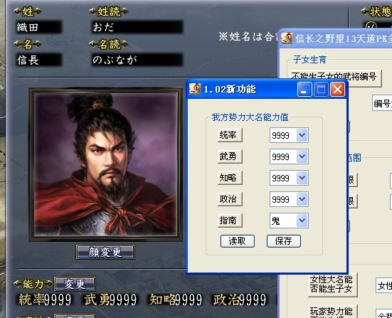 信长之野望13天道PK(威力加强版)多功能修改器 V1.03 (加入子的修改,加入每月必生等BT功能,一年24个,一门诞生,)