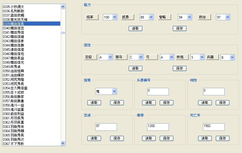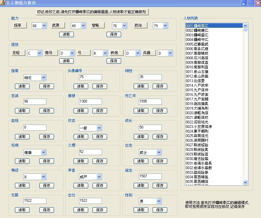 关于人物修改这快,目前很麻烦,方法和大名一样,打开人物编辑,在开修改器 ,按读取 ,如果数值正确,你就可以玩命改了,但是有个缺点,目前并不支持修改另外一个武将, 也就是说,每改一个人物 ,需要彻底关闭修改器,在打开一次,