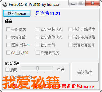 2) 将修改器放到游戏目录运行,载入fm.exe,勾选要修改的内容,确认修改