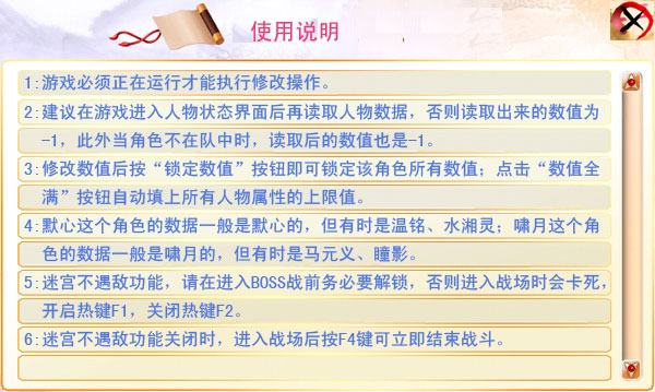 修改项目:等级、体力、真气、力量、仙骨、强壮、御法、速度、金钱、大地图不遇敌、迷宫不遇敌、战斗立即结束、人物坐标。可修改角色:夏皓、张捷、默心、啸月、瞳影、马元义、水湘灵、唐周。