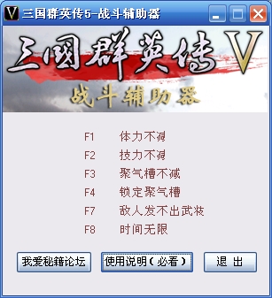 用了辅助器,当你进入到战场,我方所有武将使用武将技或组合技后,技力永不减少,当你从进入第2场战斗起,到退出游戏为止的所有战斗,你都无需等待聚气槽聚气,便可立即施展武将技或组合技,并且可以连续施展不停手,好过瘾啊!还可以让敌人使不出武将技或组合技呢(很好玩的东东)。