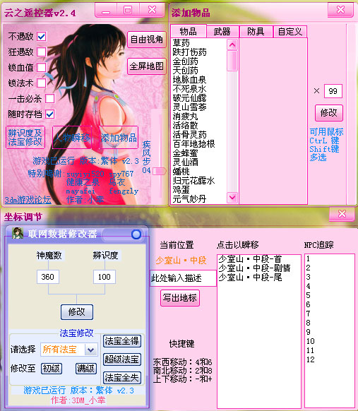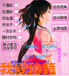 功能简介:自由视角+添加物品+NPC追踪+金钱修改+随时存档+人物瞬移+疾风步+不遇敌+锁属性+一击必杀+辨识度&法宝等级修改