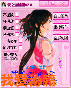 2、坐标实时调节,没多大意义。反正卡住又不常见,送给喜欢看风景的,配合视角控制。关于坐标的内存数值对应的坐标位置到现在我都不明白(包括古剑),好像跟什么浮点数有关所以这里坐标的调节比率别当回事,改天再学习了,也请高手不吝赐教。