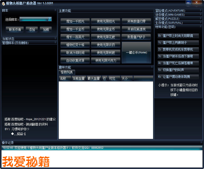 这个版本是基于之前的《植物大战僵尸全版本修改器3.4》的框架修改的。增加了几项功能,修改了几处错误。