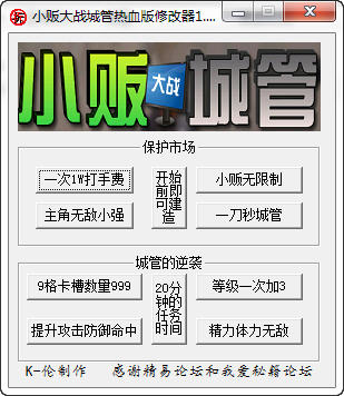 | 2011.02.16 | 小贩大战城管热血版:城管的逆袭修改器 + 10 | - | [跳] |