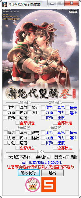 注意事项:下载后将扩展名改为RAR解压即可,可锁定角色属性,大地图不遇敌,迷宫不遇敌,其中迷宫不遇敌功能在剧情战役前需关闭,不然后卡住,此功能有待改进