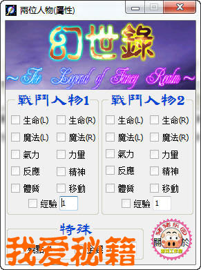 附言:<幻世录>锁定所有修改项后,有时会出现错误(会退出游戏),请自行做好保存!这款游戏用修改器锁定之后,在某章情景时,会出现[战斗人物1或2]错乱现象,有可能是游戏本身问题,见谅下!