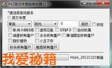 版本:英文年度版V2.5 针对的游戏版本:英文版V1.2.0.1073。 运行环境:32位XP,其他环境未测试。 功能:常规修改,混乱跳关,卡槽,攻击力,价格,冷却时间,取消冷却,透视花瓶,IZ铲子,自动收集,减速/冰冻/黄油固定所有僵尸,秒杀/魅惑所有僵尸,隐形植物,小丑不炸。 注意:某些功能使用时如果填错数值游戏会崩溃