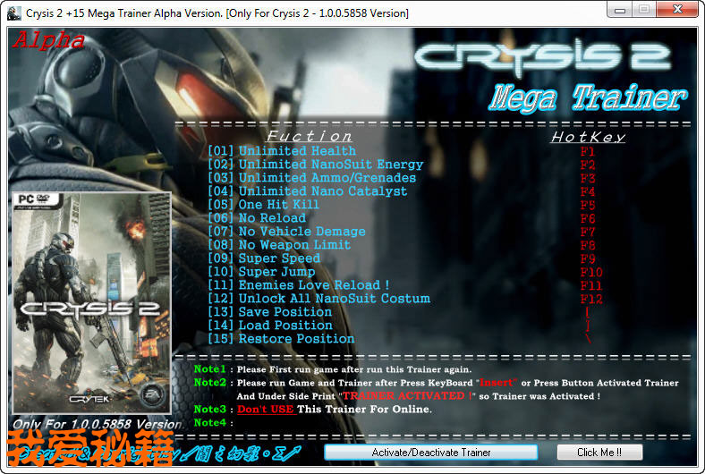 备注2:修改器上的功能启用键以红色粗字体为主,与中间下面有出现串英文(Trainer Activated!), 或按旁边"Activated/Deactivated Trainer"按钮启动,以上代表修改器已启动!!