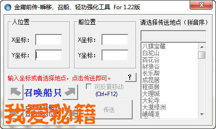 添加了列表框的快捷键,按下键直接到拼音对应的地点,修正了不断自动读取位置导致传送失败的错误。加入“可反复移动”功能,快捷键Ctrl+F12 金庸群侠前传瞬间转移修改器,目前仅对应:1.22版本。