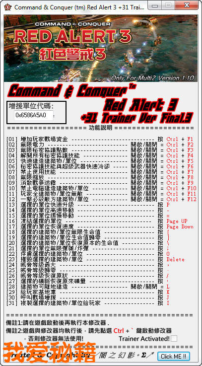 | [Ctrl] + [F1] | 增加玩家战场资金 按一次你的资金增加100000同时无金钱上限 |