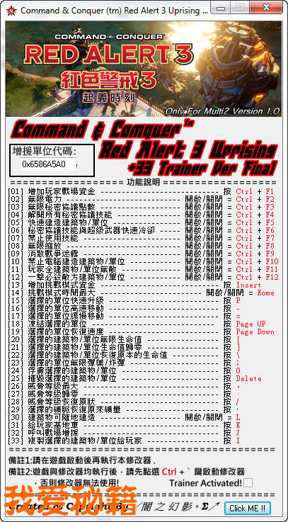 | 2011.05.30 | 红色警戒3:起义时刻v1.0修改器 + 33 | v1.0 | 附增援代码 |