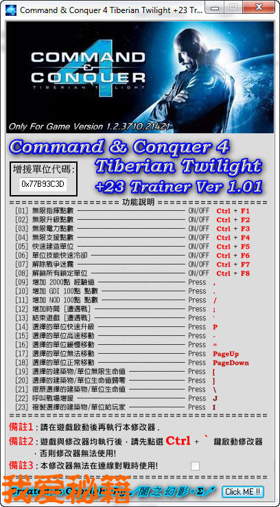 | 2011.05.30 | 命令与征服4:泰伯利亚的黄昏v1.02 & v1.03修改器 + 23 | - | - |