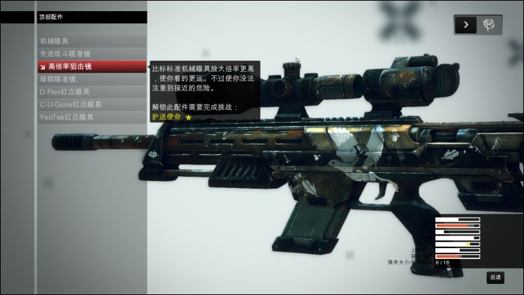 很多人开始不知道为什么没有狙击枪。打挑战任务,拿到高倍率狙击镜和消音器,你的狙击枪就完成了。。