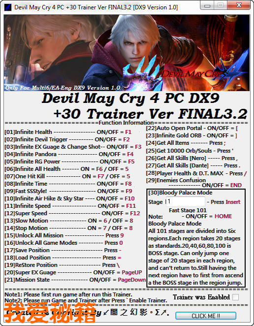 备注3:修改器上的功能启用键以红色字体为主,与右下角有串英文(Trainer was Enabled)后的框框有打勾,代表修改器已启动!!