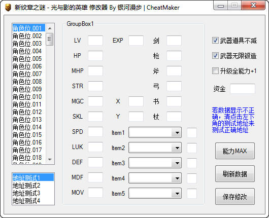 运行修改器以第一个角色作为基准 在左下角测试下地址就可以了 4个测试中总有一个会是对的