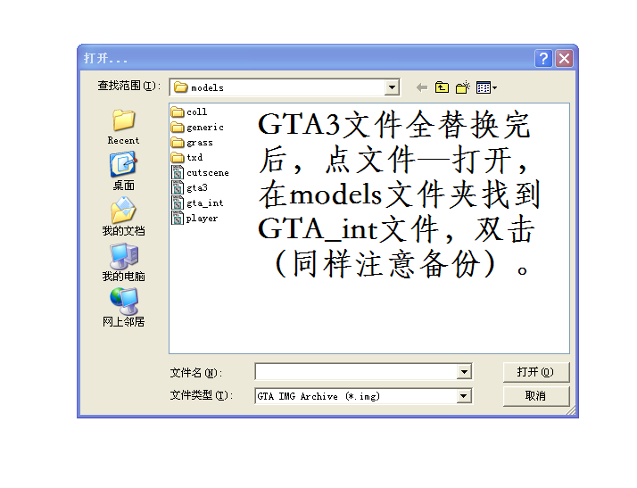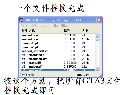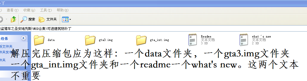 4.GTA3.IMG与GTA-INT.IMG文件夹内的文件将替换原游戏中的部分场景,该文件夹中的文件与GTA.DAT文件的关系不明,安全起见请按程序装入;