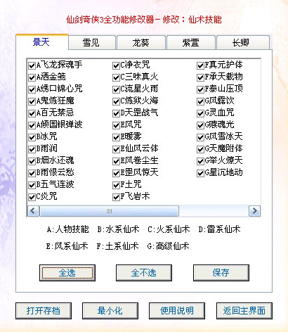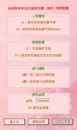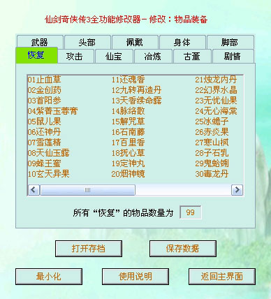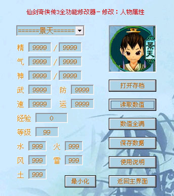 功能最强大的修改器是什么?当然是全功能修改器,可修改一切可修改的数据,本人已懂得一些修改物品装备和武学技能的方法,故本人的第一款全功能修改器诞生:《仙剑奇侠传3全功能修改器》,可修改人物属性、物品装备、仙术技能、特殊数据。更具体的修改项目见图。