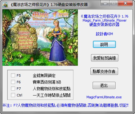 注意:使用本修改器F7人物宠物级别和技能点的记住了。必须有宠物后才能用。第一关不会玩的不要用。会玩的。在第一关跟老头儿说话完了。进农场买一块儿土地或者一桶水。随便。然后不要开始游戏。出来农场又能和老头儿说话。完了就能有宠物了。然后进农场开始农场游戏。当发现宠物出来了。就开启F7人物宠物级别技能点那个。直接升2000级以上。点满技能点就可以开始玩游戏了。还有那个Ctrl一天时间停止开关,可以把时间停止掉。等框里水果满了后再关闭,时间继续走。嘎嘎。一次能收满满果实啊。娃哈哈。然后别的没问题了。就这个特别说明。