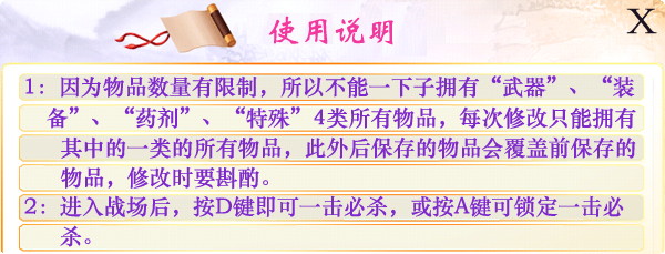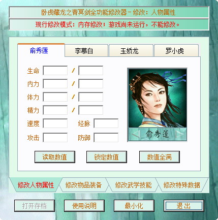 可修改一切可见数据,包括“人物属性”、“物品装备”、“武学技能”、“特殊数据”,名副其实的全功能修改器。