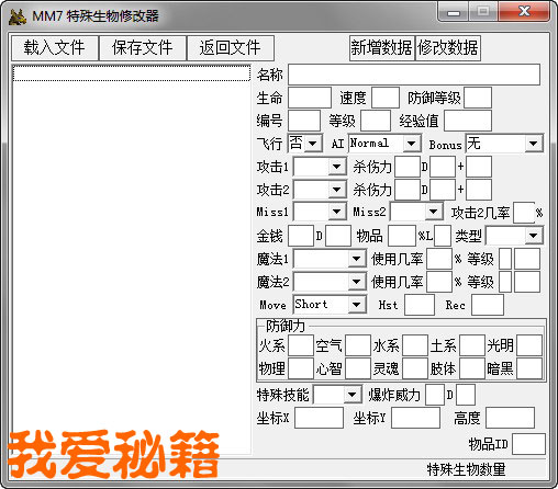 按“载入文件”按钮载入 games.lod 文件,在左侧的文件列表中双击地图文件,例如“out01.ddm”, 列出特殊生物列表,单击列表中项目,修改数据,修改完毕后按“修改数据”按钮保存数据,如果按 “新增数据”按钮则在当前位置新增插入一条特殊生物数据,最后按“保存文件”按钮把修改后的数据 保存到 games.lod 文件中。