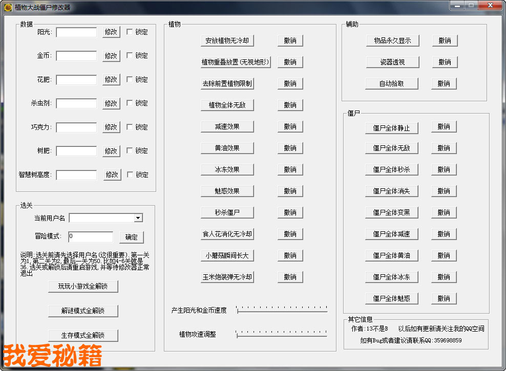 支持win7,xp,植物大战僵尸中文版,修改某项功能后如果不再使用,最好把它改回去,以防出错.