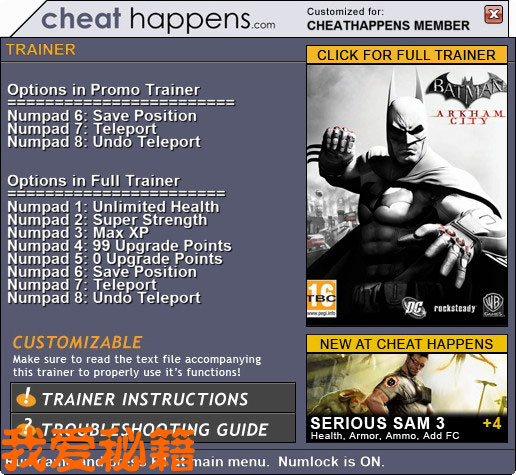 蝙蝠侠:阿卡姆之城Update 2012-03-20 DX9修改器 + 1