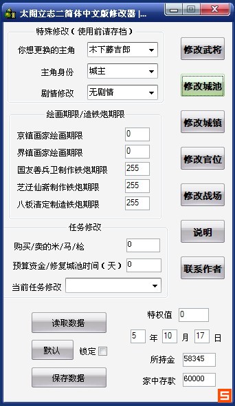 上到人物、城市下到战场数据、城镇等等都能修改,由于以前制作的太阁立志传2修改器源码不知道被我放在哪了,只能重做了。