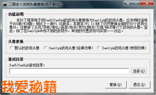 本补丁程序用于把San5/San5pk的武将头像更换为San11pk的武将头像,提供了两种头像替换效果可供选择,同时提供还原默认头像的功能,应该同时适用于DOS版/WIN版。