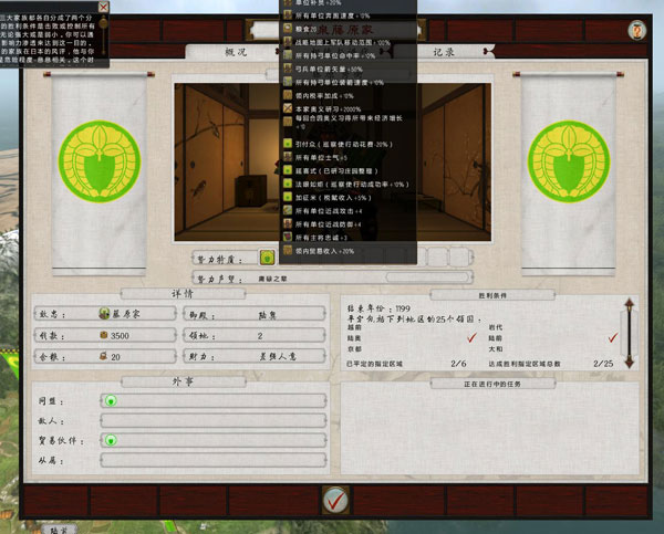 【单位补员+20%】【陆军单位战场奔跑速度+10%】【粮食20】【战略地图军队移动+100%】【弓兵备弹50%】【弓兵命中+10%】【弓兵装填+10%】【领内税收+10%】【奥义研习+2000%】(除了最后一个研习要2回合,其他都是一回合了)【回合经济增长+10】【单位士气+5】【海军移动+100%】【单位近战进攻+4】【单位近战防御+4】【领内贸易收入+20%】【主将忠诚+3】