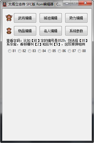 Rom编辑器的作用是静态修改游戏文件 修改后的文件可用于各类模拟器平台,比如MP4,手机等 因为SFC存在不同的Rom格式,本修改器针对*.sfc后缀的 游戏中的文字未做字码表 请自行查找字码,对应字码图已经导出