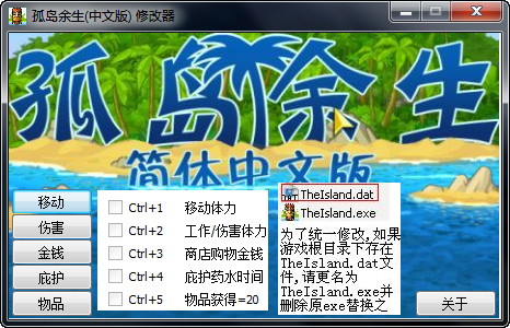 这两天有空做了下1代的孤岛余生的修改器,鉴于上次孤岛余生2汉化版的修改器不少网友反映无效等,我认为主要原因在于有些网上下的游戏源程序分为dat和exe为后缀的两文件,而真正的执行文件是TheIsland.dat,所以请在使用前把伪执行程序删除,修改TheIsland.dat的后缀为exe后才能使用本修改器。