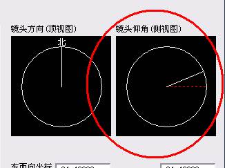 图3中右上角的镜头方向(顶视图)与镜头仰角(侧视图),这两个图示分别对应下方的Z轴(方向)与Y轴(倾斜)中的角度值。需要说明的是可以通过鼠标在图示上直接修改镜头角度,也可以在角度输入栏中输入角度。