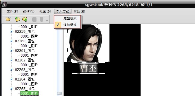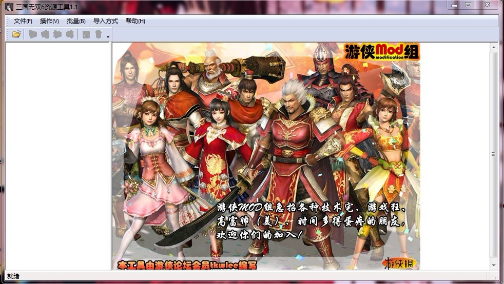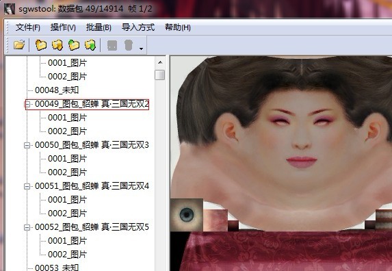 我也不清楚我能做到哪一步,如果有时间和精力会尽力做更好的版本,同时也欢迎MOD组新血加入,跟我们一起讨论MOD的艺术与技巧。 说明 1.双击sgwstool.exe执行程序,单击菜单栏“文件”->“打开”,选择《真·三国无双6》游戏目录下的BIN文件,此时工具会读入资源列表;