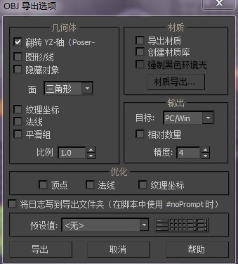 用3dsmax修改完后再导出obj时,建议采用如上的设定,不然可能会有问题。