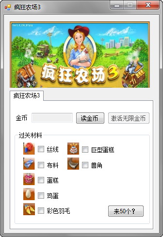 需要的有木有? 刚加入坛子不久,作为新人一定要顶。 最近同事在玩疯狂农场3,对我说过关容易,在规定的时间内过关不容易,于是就有了这个东西, c#2008 写的,加了混淆之后,360误报是木马,无语中。。。要是不放心的就不要下载了。免得说我放木马,希望版主鉴定一下, 工具里加了少量的过关材料,还有一大部分没有加进去,这个算是试玩吧,如果有人顶,我再加入全部的,最近工作不怎么顺心,以学习为主,以娱乐为辅,来支持论坛。