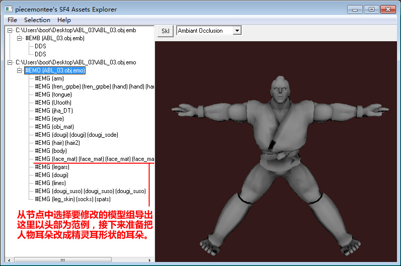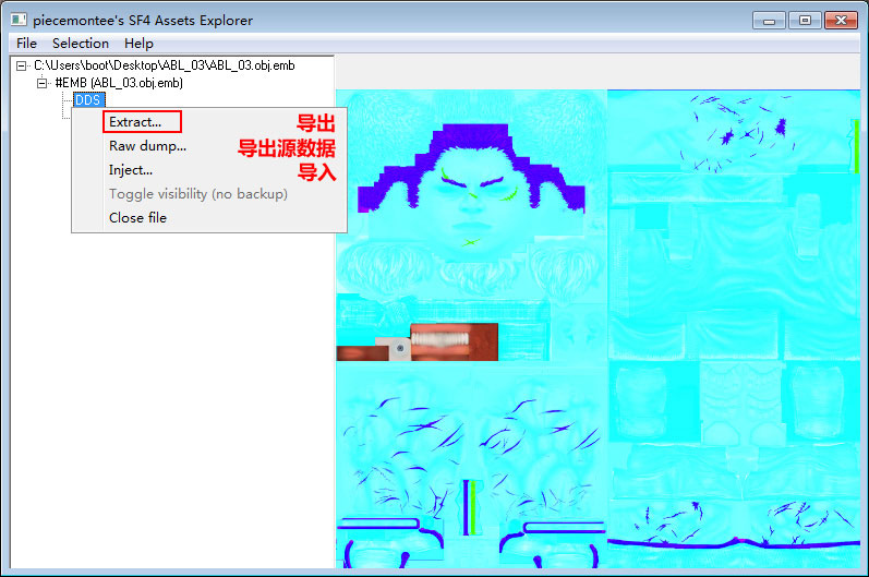 如要修改贴图,选择角色 *.emb 文件导出贴图。
