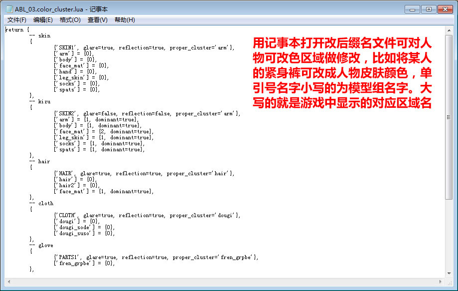 模型对应颜色修改,每个角色都有6个颜色可以定义,分别对应游戏中的人物彩绘