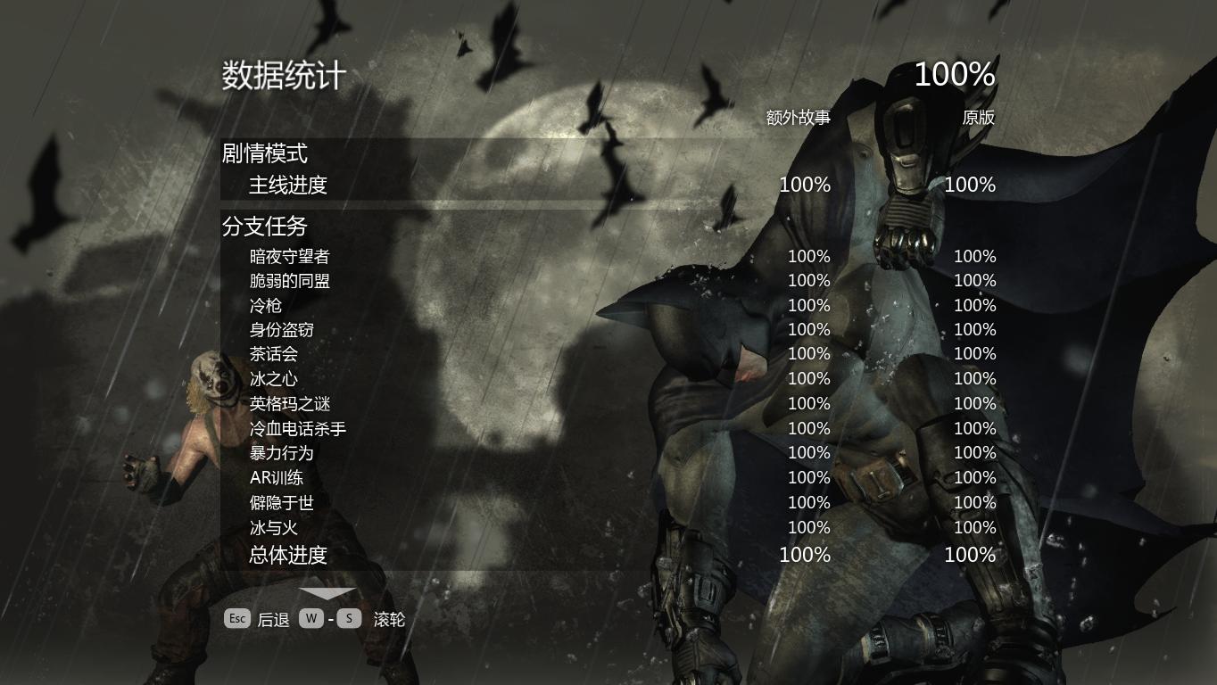 之前一直在玩上古5,剩下也没什么时间和精力玩其它游戏,玩的差不多了,4月份儿才正式开始玩蝙蝠侠阿卡姆之城,平均一天2~3个小时,今天终于100%完成度了。