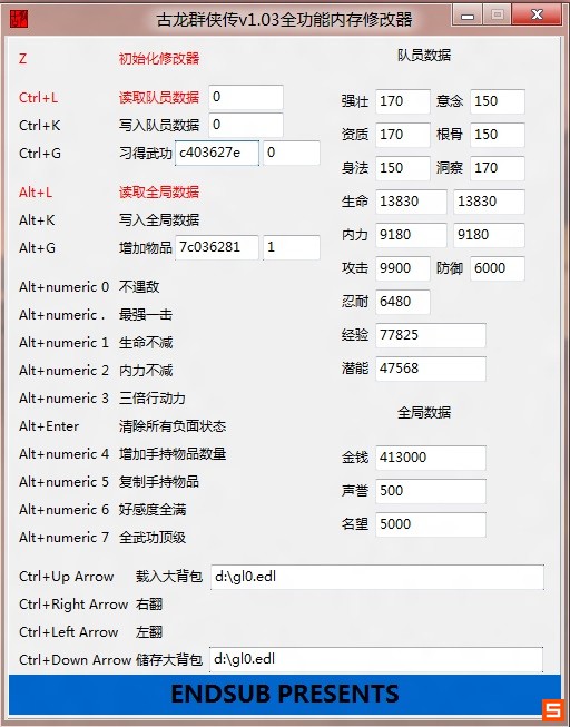 3.修改数据时,请务必遵循以下流程:读取,然后在文本框里填入所需数值,填好队员编号,返回游戏后按Ctrl+K或Alt+K修改。