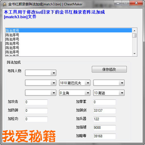 本工具用于修改list目录下的金书红颜录套阵法加成[match3.bin]文件